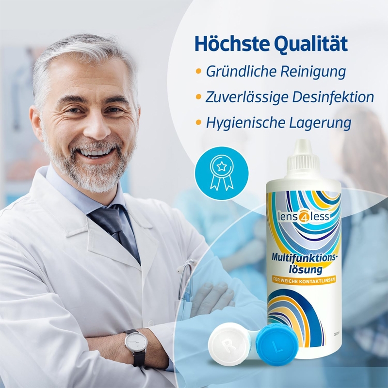 LENS4LESS Premium Kombilösung bietet umfassende Reinigung und Pflege für ihre Kontaktlinsen. Perfekter Tragekomfort auch bei empfindlichen Augen.