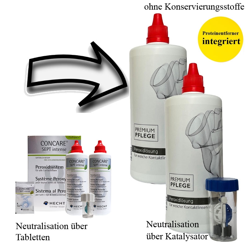 Premium Pflege - Peroxid 360ml - Die "Premium Pflege - Peroxid" ist ein einfach zu handhabendes Einstufen-Peroxid-System das für alle weichen Kontaktlinsen, auch Silikonhydrogel-Kontaktlinsen, geeignet ist.